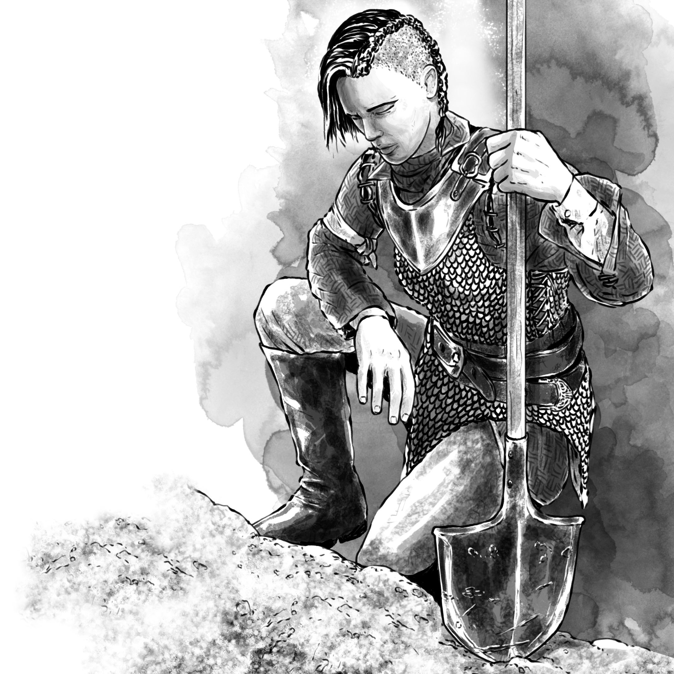 Esta devota de Azaro (la diosa de los enterramientos) ha conseguido elevar la pala, desde la banalidad de una simple herramienta de trabajo, a ratos arma socorrida, hasta el pódium de los símbolos más sagrados y reconocidos de Era. No obstante, la fama de Sioux se está extendiendo antes por su faceta de bardo que por la de guerrera o devota. Es autora de numerosas tonadas pero sobre todo del lema “¡el sol en la noche!”, que acompaña siempre la llegada del Puño Radiante, el grupo de aventureros que la acompaña y que perfectamente podría terminar convirtiéndose en una banda de música cotizada en cualquier pueblo.